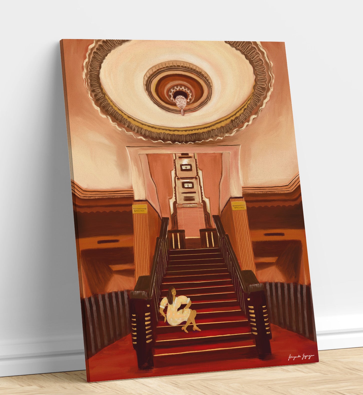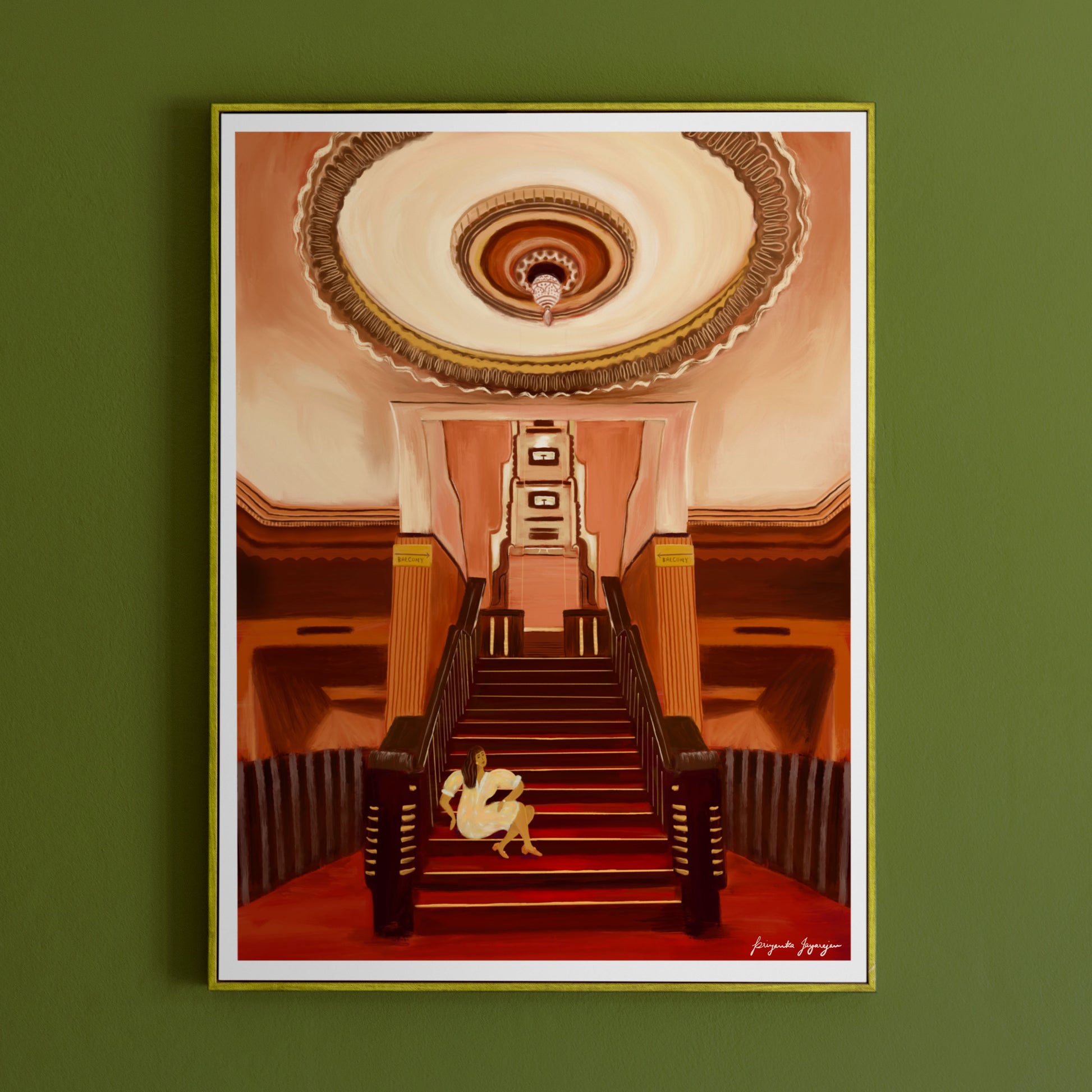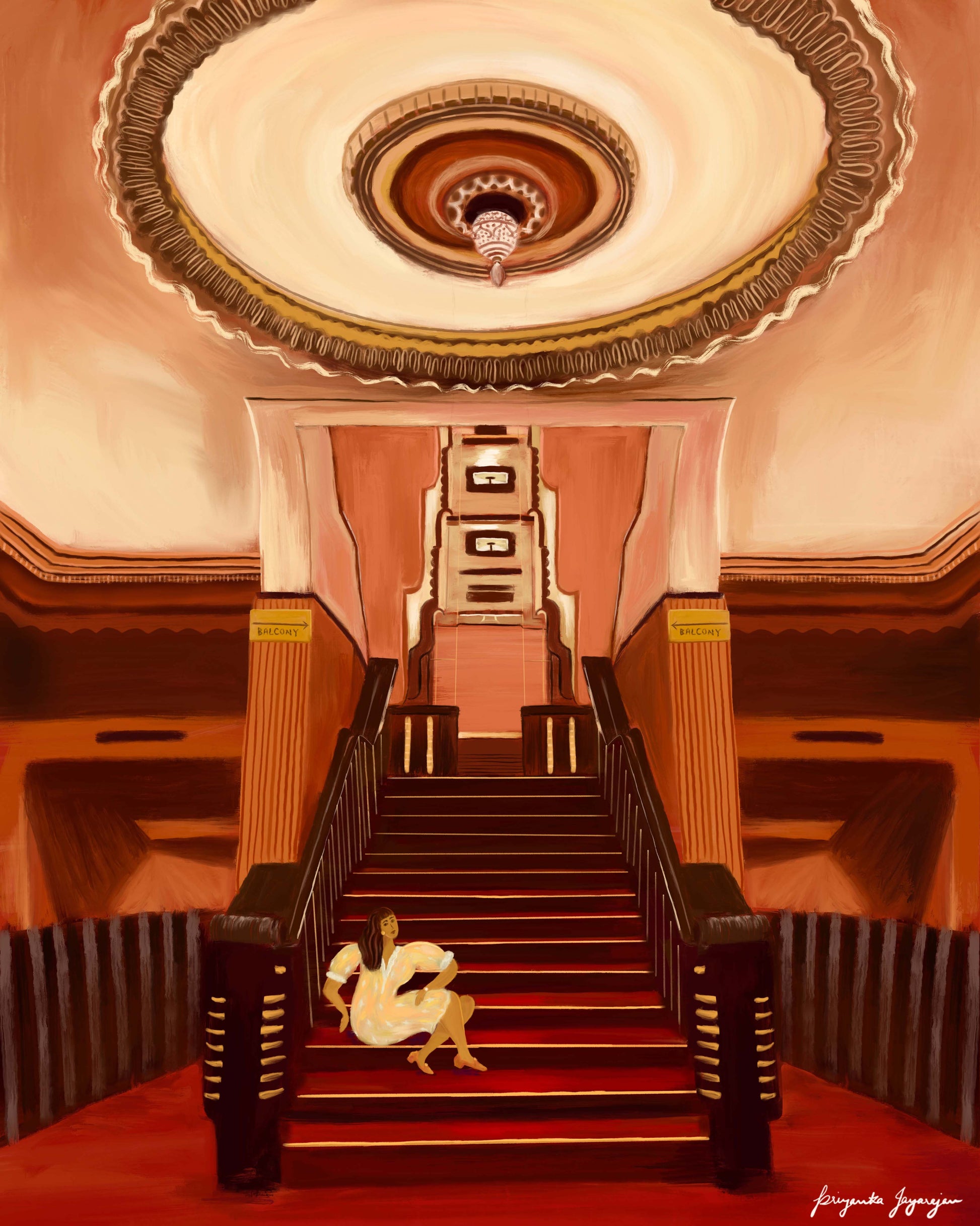 A time when waiting for a beloved latecomer at the movies looked like being in a movie. This painting, part of the Mayanagari collection, is inspired by the glamorous Liberty Cinema, Mumbai.
