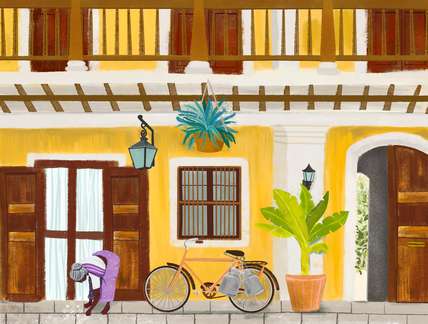 You can expect to experience sights like these while ambling along the alleys of Puducherry at dawn after a cup of kaapi (coffee). It amazes me how Pātti (grandmother) turns into a contortionist while drawing up a fresh kolam design each morning, devoted to the promise of a brand new day. Kolam is made using a paste of rice flour in these parts and the Tamil word loosely translates to form, nature or even embellishment. The practice of drawing a kolam design after wiping off any traces from the previous day has taught me to learn from yesterday and create today no matter what the outcome. Meanwhile the milkman does his daily rounds while his cycle takes a break from carrying more than it bargained for.